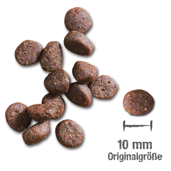 hydrolysoitu kananmaksa; ruis, mallastettu; kuivattu kananmuna; jauhettu meriplankton (krilli (5%)kuivattu panimohiiva (2.5 %); kalajauho merikalasta; kylmäpuristettu viinirypäleensiemenjauho; Chian siemen (1.3 %); johanneksenleipäpuun palot, kuivatut; natriumkloridi; kaliumkloridi, sikuri-inuliini; kuivattuja yrttejä (yhteensä 0,05%; kamomilla, fenkoli, misteli, kumina, katkero)